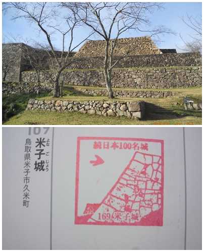 (2019-09-07) 鳥取へ梨狩りに行こうと思いつきで旅に出ました。朝一番で向かったのが米子城。スマホで確認するとスタンプはいつでも押せるようなので、朝の貴重な時間から登城できます。二の丸跡はテニス場になっており、早朝から楽しんでいる人がいます。その姿を横目に約10分の道のりを登って行くと立派な石垣が現れます。天守跡には休憩小屋があり、スタンプが置かれています。眼下には米子の街や中海が見えます。山陰随一の名城と称される壮麗な城であったそうで、天守跡の大きさが物語っているようです。 |