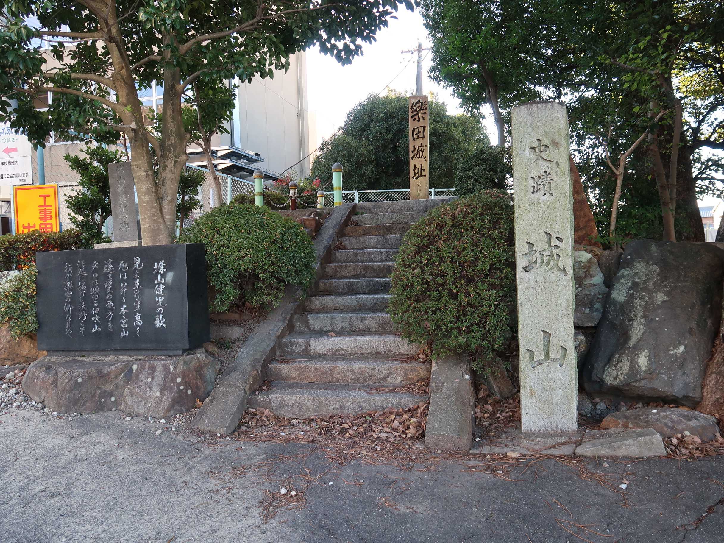 (2021-11-06) 「小口城」に続いて訪問。楽田小学校の門が開いており、中の駐車場に数台停まっていたので自分もそこに駐車しました。同敷地内に図書館も入っているのでそちらの利用客かな(^^)。校門前の城碑と案内板、本丸の小学校を撮影して3分で終了(^^)。他に見学者っぽい人はいませんでした。 |