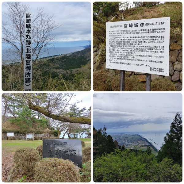歴史:寿永元年(1182)に京都を脱した北陸宮が居住し御所としたのが始まり。戦国時代には越中東部を支配した椎名家の城となり、その後、上杉家、佐々家、前田家と支配者を変え、江戸時代に廃城となった。城からは東は越後との境である親不知を望み、西は新川平野を一望の元とする。