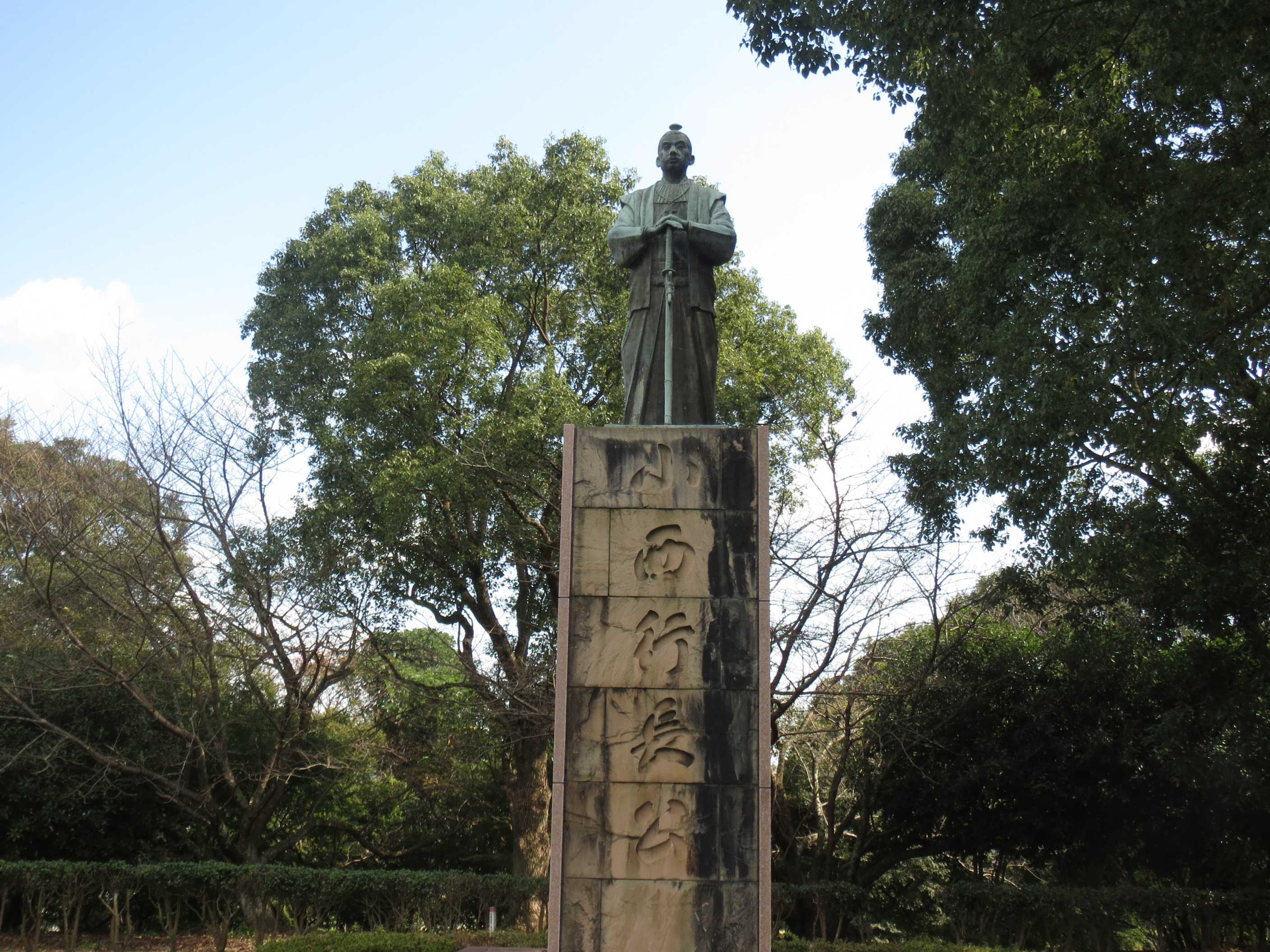 ・17/10/30 :二の丸墓園の無料駐車場から階段を登るとすぐに本丸跡の広場にでる、小西行長の銅像がある。(yasu9431さん)